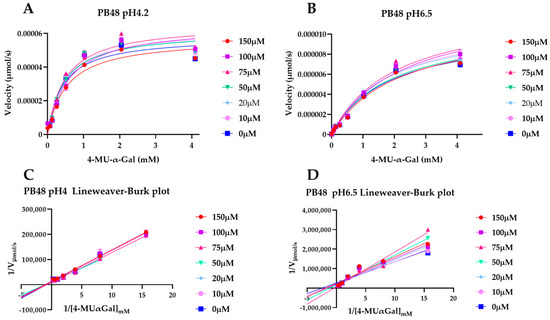PB48 stabilizes α-GalA at increased pH. Michaelis–Menten interpolated curves of velocity of 4MU-α-Gal substrate cleavage reaction against substrate concentration, following pre-incubation of α-GalA with PB48 (0–150 μM) pH 4.2 (A), or pH 6.5 (B). Corresponding Lineweaver–Burk plots (C,D) are also shown. Error bars represents ± SEM. The reaction in the presence of PB48 is accelerated at pH 6.5, compared to the untreated enzyme reaction, at least for substrate concentrations higher than 128 μM.