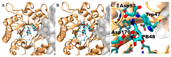 Interaction that PB48 establishes with conserved Trp47 contributes to stabilizing the homodimer formation. Interactions of galactose (A) and PB48 (B) within the binding site. Ligands are shown in chalky sticks. One protomer in the homodimer is shown in cartoon representation and the nearby chain as a solvent-accessible surface. The amino acids in contact with galactose and PB48 are shown as semitransparent sticks. (C) A close up on the PB48 interaction with Asp93 and the conserved Trp47, which is part of the protein–protein interface. Asp170 is also evidenced as a reference.