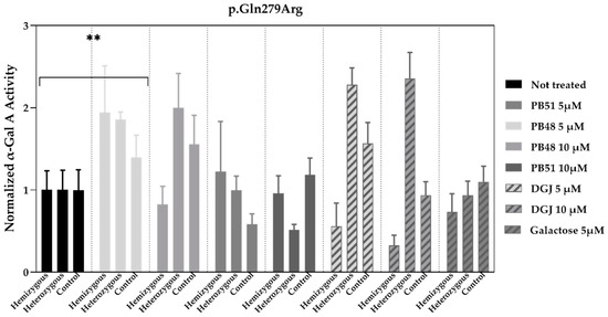 PB48 increases the activity of α-GalA in leukocytes extracted from FD patients with the p.Gln279Arg variant and healthy controls. Activity of α-GalA assessed in leukocytes extracted from FD patients with p.Gln279Arg variant (1 hemizygous and 1 heterozygous) or healthy controls (N = 2) and cultured in RPMI with either PB48, PB51, galactose, or DGJ (5 or 10 μM) for 72 h. The histograms represent mean normalized activity values for each treatment and genotype, taking non-treated cell activity value as reference. Error bars represent ± SEM. Statistical significance was assessed by Kruskal–Wallis test (** p ≤ 0.005), comparing values obtained in non-treated cells to each treatment and considering the whole group of subjects.