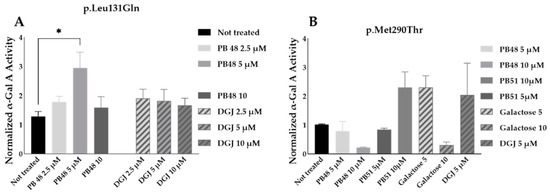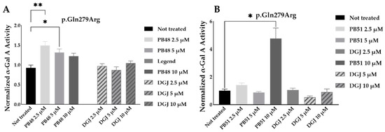 To further substantiate results, we assessed the effect of PB48 and PB51 on p.Gln279Arg variant from leukocytes from three different hemizygous patients belonging to the same family. In hemizygous patients’ leukocytes treated with either PB48, PB51, or DGJ (2.5 µM, 5 µM and 10 µM), the activity of α-GalA was significantly increased by treatment with PB48 at the concentrations of 2.5 µM and 5 µM and at higher rates compared to DGJ (Figure 8A). The treatment with PB51 significantly increased normalized α-GalA activity more than DGJ, only when applied at 10 µM (Figure 8B).