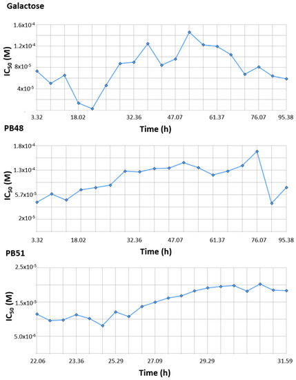 Finally, we tested the effect of PBX compounds and galactose on cell growth in the 10 μM to 1 mM range. We monitored real time cell growth by registering impedance of the cells on the plate surface for 72 h after treatment and demonstrated that there are no significant differences in cell growth curves from untreated cells compared to cells treated with PB48, PB51, or galactose (Supplementary Figure S5). The IC50 along the time of the experiment is also comparable among treatments and its value at time 52 h (linear cell growth phase) is, respectively, 8.43 × 10−5, 1.4 × 10−4, 1.4 × 10−4 for galactose PB48 and PB51 (Figure 10). We also assessed cell growth in cells treated with DGJ (0–500 μM range), obtaining comparable results to the PBXs and galactose (IC50 = 2 × 10−5 at 52 h, Supplementary Figure S6).