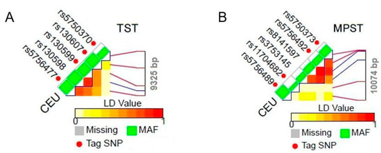 Chromosome position of LD patterns of tagSNP for TST (A) and MPST (B) gene of Utah Residents with Northern and Western European Ancestry (CEU) (according to the National Institute of Environmental Health Sciences). Abbreviations: MAF—minor allele frequency track.