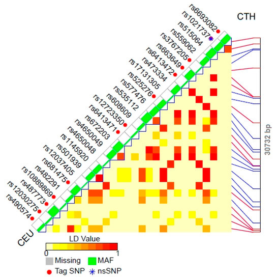 Chromosome position of LD patterns of tagSNP for CTH gene of Utah Residents with Northern and Western European Ancestry (CEU) (according to the National Institute of Environmental Health Sciences). Abbreviations: MAF—minor allele frequency track, nsSNP—non-synonymous single-nucleotide polymorphisms.