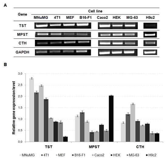 The performed gene expression analysis confirmed that the expression of all three STRs took place in all investigated cell lines: the mouse mammary gland cells MNuMG, mouse mammary gland tumor 4T1, mouse fibroblast MEF, mouse melanoma B16-F1, human colorectal adenocarcinoma Caco-2, human embryonic kidney cells HEK, human osteosarcoma MG-63, and rat myocardium H9c2. Taking into consideration the species tested, the highest TST and CTH expression level was observed in the mouse cell lines, while the MPST expression was the highest in the rat H9c2 cell line (Figure 3). Based on the data collected in Figure 3, among the chosen cell lines from three different species, the highest level of TST expression was determined in the following cell lines: MNuMG (mouse), Caco-2 (human), the highest MPST expression was detected in the 4T1 (mouse) and HEK (human) cells, and the highest level of CTH expression was revealed in the MEF (mouse) and HEK (human) cells. We tested only one rat cell line; therefore, there is no possibility of conducting similar comparison in this case.