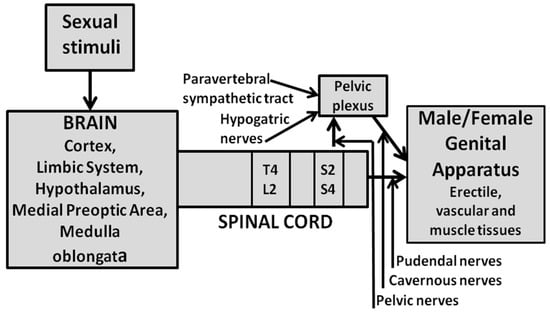 A schematic representation of the neural pathways controlling the male and female genital apparatus. When sexual (visual, auditory, olfactory, tactile and even imaginative in humans) stimuli reach the brain high centers, this activates neural pathways, to date still unknown, leading to penile erection in males and clitoris erection and vaginal lubrication in females, allowing sexual intercourse. These pathways travel from the brain, mainly from the hypothalamus and its nuclei (paraventricular nucleus, ventromedial nucleus), and medial preoptic area, through the medulla oblongata and the spinal cord, to the genital apparatus. The latter is innervated by pudendal nerves originating from the sacral S2–S4 spinal tract and containing the primary afferent sensory from and motor pathways to the penis in the male and to the clitoris in the female, and by cavernous nerves containing the primary efferent sympathetic and parasympathetic pathways originating in the pelvic plexuses. These receive neural inputs from (i) pelvic nerves originating in the sacral S2–S4 spinal tract, (ii) hypogastric nerves originating in the thoracic-lumbar (T4-L2) spinal tract and (iii) post-ganglia fibers originating from the paravertebral sympathetic ganglia of the thoracic–lumbar tract of the spinal cord (T11-L2). Details are found in [15,16,17,40,53,54,56,57,59,60,63,64,65,67,68,75].