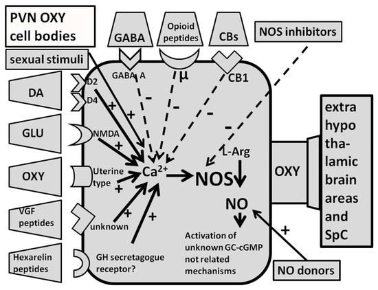 The main mechanism by which dopamine (DA) agonists of the D2 family (D2 and D4 receptor subtype), oxytocin, NMDA, hexarelin peptides and VGF peptides facilitate penile erection and copulatory activity in male rats is the activation of oxytocinergic neurons originating in the PVN and projecting to the spinal cord and to extrahypothalamic brain areas. Apparently all the above compounds, by acting on their own receptors localized in the cell bodies of these oxytocinergic neurons, increase Ca2+ ions influx in the cell bodies of these neurons, in turn causing the activation of NO synthase (NOS), the Ca2+ calmodulin-dependent enzyme present in oxytocinergic cell bodies that converts the amino acid l-arginine (l-Arg) to nitric oxide (NO). NO in turn activates oxytocinergic neurons to release oxytocin in the spinal cord and in extrahypothalamic brain areas inducing penile erection and facilitating sexual behavior by a mechanism not involving the guanylate cyclase-cyclic guanosine monophosphate (GC-cGMP) pathway, as discussed below (Section 2.4.2). PVN oxytocinergic neurons facilitate penile erection and sexual activity not only when activated by the above compounds, but also by drugs that increase PVN NO concentration (NO donors), by the blockade of PVN CB1 receptors (which are not located on oxytocinergic cell bodies but increase the activity of the latter ones by increasing glutamatergic neurotransmission in the PVN) (see Section 2.2.4/Figure 3), and by physiological sexual stimuli (e.g., pheromones and others). Conversely, when these oxytocinergic neurons are inhibited, for instance by gamma-amino-butyric acid GABA, opioid peptides/opiate drugs or by drugs that inhibit NOS activity, the spontaneous (i.e., physiologically activated) or drug/neuropeptide-stimulated erectile function and sexual activity is reduced. Details are found in [16,17,40,53,54,55,56,57,73,77,88,89,90,91,92,93,100,101,102,103,104,105,106,107,108,109,110,111,112,113,114,115,116].