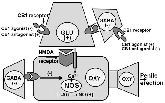 Changes in NO synthase activity at the level of the PVN are also involved in the inhibitory effect of cannabinoid receptors of the CB1 subtype on penile erection. This became evident when a selective antagonist of the CB1 receptor subtype SR 141716A [94], was found capable of inducing penile erection when injected into the PVN of male rats [95]. Apparently, the blockade of CB1 receptors in the PVN induces penile erection by activating glutamatergic neurotransmission in the PVN. Glutamic acid, in turn, increases Ca2+ influx in the cell bodies of PVN oxytocinergic neurons causing the activation of NO synthase and the increase in NO production leading to penile erection (Figure 3). Accordingly, SR 141716A-induced penile erection occurs with an increase in extracellular glutamic acid and NO production in the male rat PVN dialysate [100,101]. Penile erection and the increase in NO production, but not in extracellular glutamic acid induced by SR 141716A, are antagonized by the blockade of NMDA receptors in the PVN with (+)-MK-801, and by the inhibition of NO synthase in the PVN by L-NAME [95,100,101]. In contrast, SR 141716A-induced penile erection, increased NO production and glutamic acid release in the male rat PVN dialysate were all antagonized by morphine [112]. As to the activation of glutamatergic neurotransmission that causes penile erection by stimulating PVN oxytocinergic neurons mediating penile erection secondary to the blockade of CB1 receptors in the PVN, this may be due to CB1 receptors that directly inhibit glutamatergic synapses impinging on oxytocinergic neurons mediating penile erection or to CB1 receptors located in inhibitory GABAergic synapses impinging on glutamatergic synapses and whose blockade decreases the GABA-mediated inhibition of these synapses [100,101,112,113] (Figure 3). Further studies are required to discover if one of the two mechanisms is the most relevant or if the two mechanisms are not mutually exclusive. Irrespective of the exact mechanisms by which cannabinoids inhibit erectile function, this inhibitory effect is mediated at least in part by a reduction in NO activity at PVN level [100,101,112,113].
