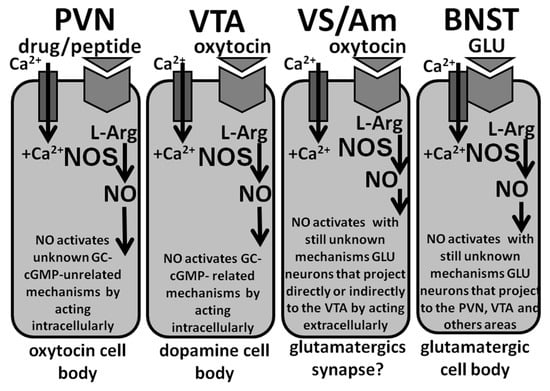 In the ventral tegmental area, NO plays a role in the activation of mesolimbic dopaminergic neurons induced by the injection of oxytocin apparently with a mechanism similar only in part to that found in the PVN. Accordingly, the available data suggest that oxytocin injected into the caudal part of the ventral tegmental area of male rats stimulates oxytocinergic receptors located in the cell bodies of mesolimbic dopaminergic neurons. This causes an increased Ca2+ influx inside the cell bodies of these dopaminergic neurons, thereby activating neuronal NO synthase. At variance from the PVN, newly formed NO, in turn, activates guanylate cyclase, which is co-localized with NO synthase in the cell bodies of dopaminergic neurons. As discussed below, this increases cGMP levels and activates mesolimbic dopamine neurons to release dopamine in the nucleus accumbens causing penile erection [47,48] (see also Section 2.4.1, Section 2.4.3, Section 3, and Section 3.1.1).