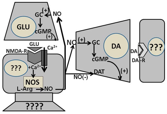 In the medial preoptic area, NO is formed in NO synthase-containing neurons/cells that are activated to facilitate the release of dopamine by the nerve endings of glutamatergic neurons originating in the amygdala and the bed nucleus of the stria terminalis, which are stimulated by sexual (mainly olfactory, i.e., pheromones) stimuli [178,179,183,184,185]. Glutamic acid activates dopamine release by acting on NMDA receptors coupled to voltage-dependent Ca2+ channels in still unknown medial preoptic neurons/cells. The increased Ca2+ influx activates NO synthase to increase NO production. Once released, NO in turn travels as a retrograde messenger to dopaminergic synapses and possibly also to the glutamatergic synapses, where it activates guanylate cyclase to increase cGMP levels to facilitate dopamine release to improve copulation and sustain glutamic acid release to maintain dopamine release (Figure 5) [39,178,179,180,181,182,183,184,185]. Accordingly, in male rats (i) NO synthase inhibitors, when injected into the medial preoptic area, abolish both dopamine and glutamic acid release that occur in the medial preoptic area during copulation and impair sexual behavior; (ii) 8-Bromo-cGMP facilitates dopamine release and copulation, while ODQ inhibits glutamic acid and dopamine release and copulation as well (Table 10) [181,182,183]. NO facilitates sexual behavior in male rats by acting not only in the medial preoptic area, but also in the PVN. Accordingly, (i) NO production increases in the PVN when penile erection occurs in physiological contexts; that is, when male rats show non-contact erections in the presence of an inaccessible sexually receptive female or when it occurs during copulation, and (ii) inhibition of NO synthase in the PVN prevents non-contact erections and impairs copulation. However, at variance from the medial preoptic area, in the PVN NO facilitates sexual behavior by a yet undiscovered mechanism not involving cGMP [74].