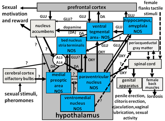 Nitric oxide produced by NO synthase (NOS) participates in a complex neural circuit that controls sexual motivation, reward and performance at central level together with other neurotransmitters and neuropeptides. This circuit interconnects the hypothalamus and its nuclei (paraventricular and ventromedial) with limbic areas (ventral tegmental area, hippocampus, amygdala, bed nucleus of the stria terminalis) and with the ventral medulla and spinal cord. Among neural pathways involved are (i) PVN oxytocinergic neurons that send their projections to the ventral medulla and spinal cord, and to the ventral tegmental area, hippocampus, amygdala and bed nucleus of the stria terminalis; (ii) mesolimbic/mesocortical dopaminergic neurons originating in the ventral tegmental area that send projections to the nucleus accumbens, medial prefrontal cortex, bed nucleus of the stria terminalis, hippocampus and amygdala; (iii) glutamatergic neurons that interconnect the hippocampus and the amygdala with the ventral tegmental area, prefrontal cortex, bed nucleus of the stria terminalis, medial preoptic area and PVN; (iv) neurons that project from the ventromedial nucleus of the hypothalamus to the periaqueductal gray matter and from here to the spinal cord (dashed lines), which control lordosis in estrous females and whose activity is modulated by different brain areas (medial preoptic area, ventral tegmental area, lateral septum). When this circuit is activated by physiological stimuli (i.e., pheromones released by sexually receptive females in males or by sexually potent males in females and/or other sexual stimuli) or by drugs or peptides given in one of the areas of the circuit, NO becomes involved at different sites, i.e., in the paraventricular and ventromedial nuclei and medial preoptic area, which are involved more in sexual performance (penile erection and copulation in males, lordosis in females), and the ventral tegmental area, hippocampus, amygdala and bed nucleus of the stria terminalis, which act on mesolimbic/mesocortical dopaminergic neurons that control sexual motivation, arousal and reward (light blue boxes indicate the brain areas of the circuit containing NO synthase). Thus, changes in NO activity in these brain areas participate in the modulation of both sexual motivation/arousal/reward and sexual performance (erectile function/lordosis/copulation). (?) = unknown neurotransmitters/neuropeptides. Details are found in [4,16,17,26,47,49,53,54,55,56,57,64,65,66,67,68,69,70,96,97,98,99,104,143,144,151,152,160,174,179,183,184,185,190,192,193,194] and references therein.