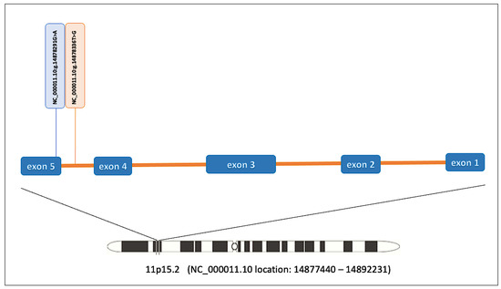 - Chr11: 14.88M-14.89M-Genome Data Viewer-NCBI. Available online: https://www.ncbi.nlm.nih.gov/genome/gdv/browser/nucleotide/?id=NM_024514.5 (accessed on 3 December 2021).
