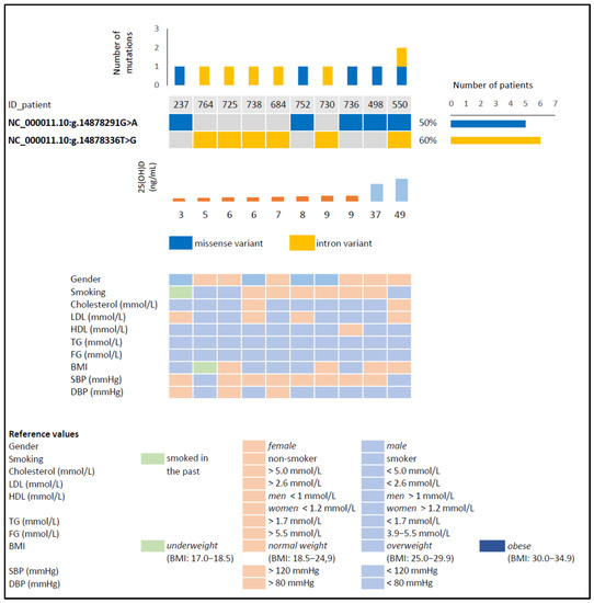Basic characterization of patients with detected variants of the selected fragments of the CYP2R1 gene. Abbreviations: 25(OH)D—25 hydroxyvitamin D; LDL—low-density lipoprotein; HDL—high-density lipoprotein; TG—triglycerides; FG—fasting glucose; BMI—body mass index; SBP—systolic blood pressure; DBP—diastolic blood pressure.