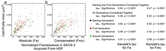 | Kendall’s Tau of Correlation between Cell-Profile Area and Receipt of HDF Fluorescence by SAOS-2 Cells | ||