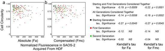 | Kendall’s Tau of Correlation between Cell Circularity and Receipt of HDF Fluorescenceby SAOS-2 Cells | ||