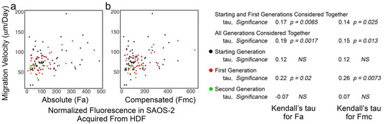 | Kendall’s Tau of Correlation between Cell Migration Velocity and Receipt of HDF Fluorescence by SAOS-2 Cells | ||