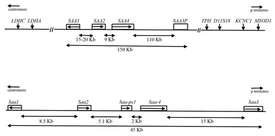 - Sellar, G.C.; Jordan, S.A.; Bickmore, W.A.; Fantes, J.A.; van Heyningen, V.; Whitehead, A.S. The human serum amyloid A protein (SAA) superfamily gene cluster: Mapping to chromosome 11p15.1 by physical and genetic linkage analysis. Genomics 1994, 19, 221–227. [Google Scholar] [CrossRef] [PubMed]