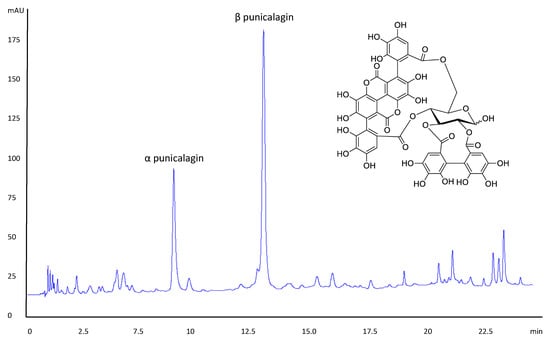 The chromatogram shown in Figure 1 highlights the multiple tannin compounds present in PRE and—in particular—punicalagin, which exists as two anomers in a characteristic 1:2 ratio: α-punicalagin with retention time of 7.38 min and anomer β-punicalagin with retention time 11.74 min. The identity of punicalagin was also confirmed of punicalagin by comparison with purified punicalagin. Spiking with standard punicalagin gave rise to both α and β punicalagin peaks, and this was also used to prepare a standard calibration curve from which it was determined that the mean punicalagin level in the 2 extracts was PRE was 21.7% (1 mg in each 4.61 mg of PRE). The level of punicalagin, which is known to be the main active component of PRE, is provided to allow a comparison with other papers.