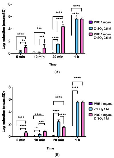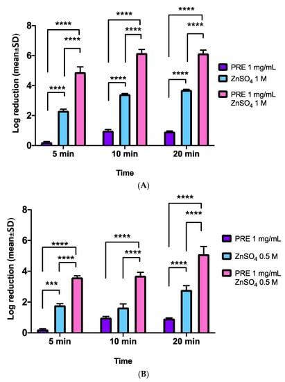 Log10 reductions in MRSA CFUs at incubation times of 5 min, 10 min, 20 min, and 1 h (n = 9 ± SD). (A) PRE (1 mg/mL), and Zn (II) (0.5 M) alone and in combination. (B) PRE (1 mg/mL), Zn (II) (1 M) alone, and in combination. Tukey’s multiple comparison post-hoc test show statistically significant differences (* p ≤ 0.05, ** p ≤ 0.01, *** p ≤ 0.001, **** p ≤ 0.0001).