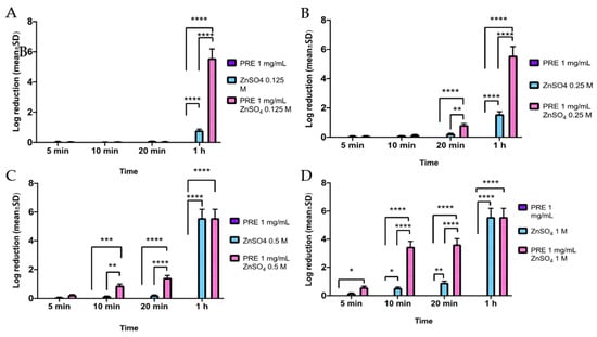 Log10 reduction of S. epidermidis CFUs at incubation times of 5 min, 10 min, 20 min and 1 h (n = 9 ± SD). (A) PRE (1 mg/mL) and Zn (II) (0.125 M), alone and in combination. (B) PRE (1 mg/mL) and Zn (II) (0.25 M) alone and in combination. (C) PRE (1 mg/mL) and Zn (II) (0.5 M) alone and in combination. (D) PRE (1 mg/mL) and Zn (II) (1 M) alone and in combination. Tukey’s multiple comparison post-hoc test show statistically significant differences (* p ≤ 0.05, ** p ≤ 0.01, *** p ≤ 0.001, **** p ≤ 0.0001).