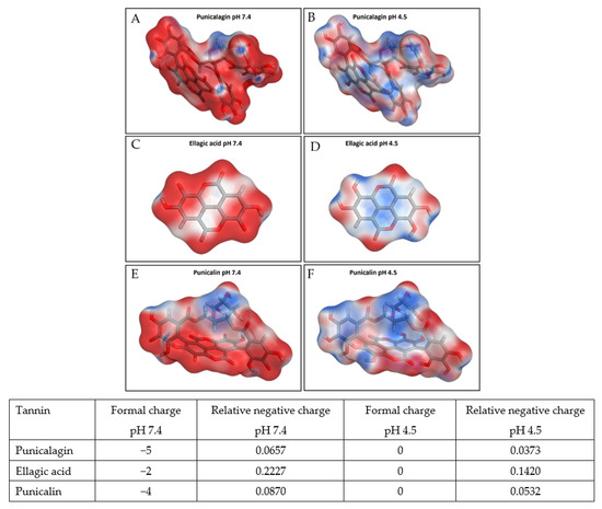 Electrostatic surface maps of punicalagin, ellagic acid, and punicalin at pH 7.4 and pH 4.5. Punicalagin, like other tannins, possesses a negative charge at pH 7.4; however, they are all neutral with almost equal distribution of electrostatic charge positive and negative at pH 4.5. The areas colored in red and blue represent respectively negative and positive regions of the electrostatic potential. Table contains computed charges for punicalagin, ellagic acid, and punicalin, confirming absence of charge at pH 4.5.