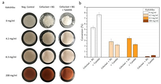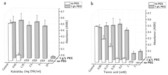 The LPMO TaAA9A was tested further for its susceptibility to inhibition on the chromogenic substrate AZCL-HEC (Megazyme; Ayr, Scotland). Samples containing TaAA9A (1 µM), AZCL-HEC (0.4 mg/mL), and ascorbate (2 mM) were incubated for 15 h, in the absence and presence of PEG (1 g/L). Two inhibitory components were tested in a dose-dependent manner—Kakishibu (0–10 mg DW/mL) and tannic acid, a persimmon component (0–4 mM).