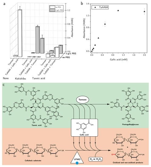 In addition to PEG–polyphenol interaction, we tested if the observed negative effect on the LPMO could be alleviated by enzymatic treatment. Tannases (tannin acyl hydrolases) are enzymes that break down gallotannins, ellagitannins, and complex tannins by the hydrolysis of their ester bonds [29]. Specifically, we investigated whether degradation of Kakishibu tannins and tannic acid could also rescue the LPMO from inhibition. An added benefit to tannin hydrolysis would be the steady production of gallic acid, a compound which is a well-known activator for LPMOs [24]. Figure 3a shows the effect of tannase or gallic acid addition to the inhibited TaAA9A. In the absence of PEG, the presence of tannase was only able to alleviate the inhibition by tannic acid, while the LPMO remained inactive in the presence of Kakishibu. The inability of tannase to alleviate the apparent polyphenol inhibition by Kakishibu may stem from the complexity of the juice’s tannins and other polyphenol constituents. In the presence of PEG and the absence of a reductant, the addition of tannase enzyme alleviated LPMO inhibition from both Kakishibu and tannic acid. The positive effect of tannase addition was likely achieved through the breakdown of tannic acid and Kakishibu tannins into their gallic acid monomer. Figure 3b illustrates that a dose-dependent TaAA9A-activation can be obtained, when gallic acid is used as the LPMO reductant. In addition to the removal of inhibitory polyphenols, the gradual release of gallic acid from tannase-mediated tannin hydrolysis could provide a steady supply of LPMO reductant (Figure 3c).