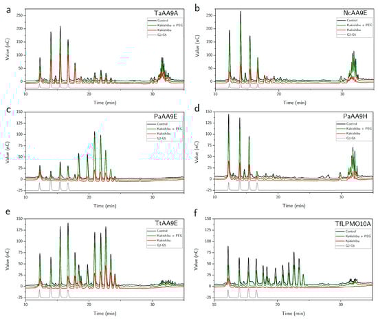 HPAEC chromatograms of the LPMO product profiles were obtained in the absence (black) and presence (red) of Kakishibu. Once again, PEG was used to alleviate the inhibition (green). The LPMO-specific oxidation products were observed for each enzyme, despite differences in the product profiles between the tested LPMOs. The weakest inhibition by Kakishibu on this cellulosic substrate was observed for TaAA9A (Figure 4a). The other five LPMOs displayed higher susceptibility to Kakishibu inhibition, when compared to TaAA9A, with the bacterial LPMO, TfLPMO10A, exhibiting almost complete inhibition (Figure 4f). In all cases, addition of PEG protected LPMO activity to varying extents, which was consistent with the previously obtained results (Figure 2 and Figure 3a).
