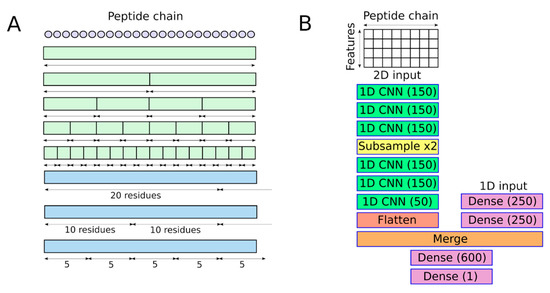 The deep neural network for CCS prediction and its input features: (A) subsequences used for the creation of input features for dense layers; borders of subsequences with non-integer length are rounded in such a way that at least one residue is included in each subsequence; (B) architecture of the neural network. Numbers in parenthesis denote the number of output channels or nodes (only for trainable layers).