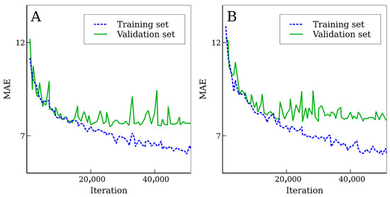 A total of 50 training epochs (full data set runs) were performed. Every 1000 training iterations and after each epoch (1770 iterations), validation using the validation set was performed. The best validation set accuracy (in terms of MAE) was obtained after 26,000 iterations (~15 epochs). However, after 14,160 iterations (8 full epochs), accuracy was almost constant, and only a minor improvement in the validation set accuracy was achieved. The learning curve is demonstrated in Figure 2A. Accuracies of the NN after 26,000 and 14,160 training iterations were similar to each other for both test sets. Further training led to a minor improvement in terms of MdPE, but other error measures slightly increased. The best result in terms of MdPE for the validation set was after 43 epochs (76,110 training iterations).