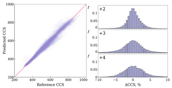 The results of the accuracy evaluation and comparison with the previous work [16] are given in Table 3. Our model outperformed the previously published RNN for the ProteomeTools test set. An equal or better performance was observed for all charge states (separately), for all ranges of CCS values and all considered accuracy measures. It can be concluded that the 1D CNN gives an appropriate accuracy for the prediction of CCS values for peptides and can be used instead of the RNN or together with the RNN as part of an ensemble of models. An ensemble of independent models is usually more accurate than each of the models [19,20,23]. The averaging of the results of various models improves the accuracy [20]. Figure 3 demonstrates a correlation between the predicted and reference values and error distributions for different charge states.