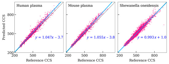 The MAE, MdPE, Δ90, and r values were 16.0 Å2, 2.73%, 7.10%, and 0.984, respectively. This accuracy is still satisfactory but worse compared with previously considered test sets. Table 4 shows the accuracy of CCS prediction for peptides extracted from various organisms separately. The correlation coefficient and the coefficient of determination are almost the same for these three organisms. However, other accuracy measures are much worse for human plasma and mouse plasma. This could be caused by a systematic error. Figure 4 shows correlations between the predicted and reference values, and there is a significant systematic error for human plasma and mouse plasma. Most likely, this error was introduced during the computation of CCS values by the authors of reference [13].