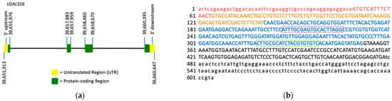 LGALS16 gene structure and the mRNA sequence. (a) LGALS16 (4735 bp) is located on chromosomal band 19q13.2 and contains 4 exons (ENSG00000249861). (b) NCBI reference sequence of LGASL16 mRNA (NM_001190441.3). Each exon is highlighted with red, orange, blue, and black representing exons 1, 2, 3, and 4, respectively. The protein coding sequence (CDS) is indicated in capitals while UTRs in small characters. The oligonucleotide sequences for PCR amplification are boxed.