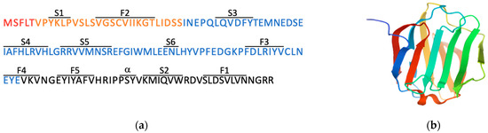 Protein sequence and structure of recombinant galectin-16. (a) The 142 amino acid sequence is 16.6 kDa for the galectin-16 protein. Each color corresponds to the exon from which the amino acids were encoded with red, orange, blue, and black representing exons 1, 2, 3, and 4, respectively. The anti-parallel β-sheets of F-face (F1–F5) and S-face (S1–S6) strands as well as a short α-helix are showed. (b) The crystal structure was extracted from Protein Data Bank (available online: rcsb.org, accessed on 6 September 2021), PDB ID: 6LJP.