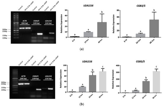 LGALS16 expression in human placental choriocarcinoma cell lines, BeWo and JEG-3. Cells were treated with 8-Br-cAMP (250 μM) for different periods of time to induce syncytiotrophoblast differentiation. (a) BeWo cells (n = 4); (b) JEG-3 cells (n = 3). Agarose gels on the left confirm the expected size of PCR amplicons. Bar graphs show the fold changes in the expression of LGALS16 and CGB3/5 genes obtained by qPCR, which were quantified by the Livak method (2−ΔΔCT) using ACTB as a reference gene. Data are presented as means ± SD; means with the same letter are not significantly different from each other (Tukey’s post hoc HSD test, p > 0.05).