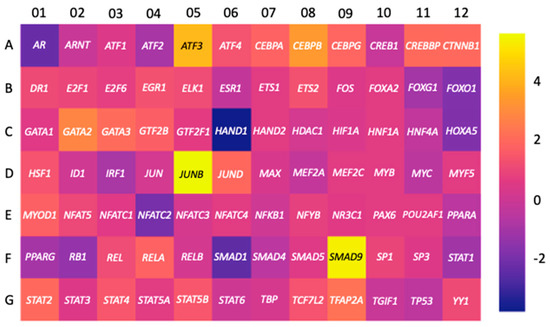 Changes in the expression of genes encoding TFs in JEG-3 cells. Cells were treated 8−Br−cAMP (250 μM) for 36 h to induce trophoblastic differentiation and Qiagen RT2 Profiler™ PCR Array kit was used to assess fold changes in gene expression between differentiated and control cells presented as a heatmap.