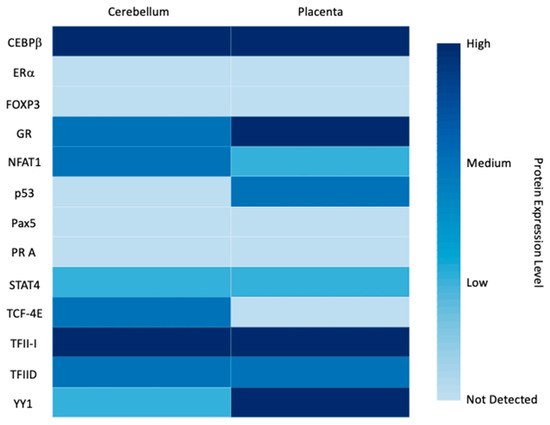 Protein expression patterns of predicted transcription factors for LGALS16 regulation in the cerebellum and placenta.