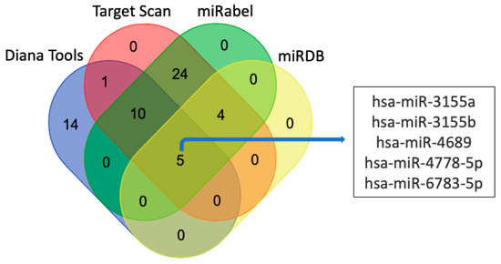 Post-transcriptional control of mRNA availability for protein synthesis depends on miRNAs which can hybridize to complementary sequences in protein-coding mRNAs at the 3′ untranslated region and either block protein translation or induce mRNA degradation [52]. Multiple miRNAs were predicted to target the LGALS16 transcript by bioinformatics tools, such as Diana Tools [17], miRabel [18], miRDB [19], and TargetScan [20], which use different algorithms and methods. A robust application of these tools using default options shows that five miRNAs (hsa-miR-3155a, hsa-miR-3155b, hsa-miR-4689, hsa-miR-4778-5p, hsa-miR-6783-5p) are predicted by all four of these online platforms (Figure 8). These miRNAs among others can be considered as perspective candidates for regulating the stability and/or translational potential of the LGALS16 transcripts, especially in relevant tissues such as placenta and brain. Indeed, a significant decrease in hsa-miR-4778-5p expression during gestation in exosomes from maternal blood was associated with preterm birth pregnancies [53]. Expression of hsa-miR-3155a was significantly upregulated in the anterior cingulate cortex of deceased patients with major depressive disorder [54]. In comparison, the expression of hsa-miR-4689 was downregulated in exosomes isolated from the plasma of patients with mesial temporal lobe epilepsy with hippocampal sclerosis compared to controls [55]. Differential expression of exosomal hsa-miR-4689 and hsa-miR-6783-5p was reported in patients with intracranial aneurysms [56]. Human miRNA tissue atlas confirms expression of hsa-miR-3155a, hsa-miR-3155b, hsa-miR-4689, and hsa-miR-4778-5p in brain among other tissues at variable levels [57]. Unraveling possible mechanisms of miRNA-mediated regulation of galectin-16 in these tissues awaits future research.