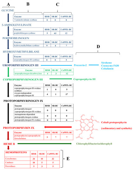 Biosynthesis of heme b including products (A) and enzymes (B); number of sequences of enzymes involved in heme b biosynthesis detected in metaproteome of BISR (bacteria inhabited shale rock) and proteomes of SR-BC (shale rock-bacterial culture) and CoPPIX-BC (cobalt protoporphyrin-bacterial culture) (C); biotransformation of uroporphyrinogen III, coproporphyrinogen and heme b not studied in this study (D). Number of sequences of hemoproteins (cytochromes, peroxidases, and catalases) detected in the studied metaproteome of BISRand proteomes of SR-BC and CoPPIX-BC (E). The figure does not take into account the transformation of heme b into other types of heme. Numbers of sequences of detected enzymes are presented in Tables S4 and S5. The PPIX transformations studied in this study are marked in red.