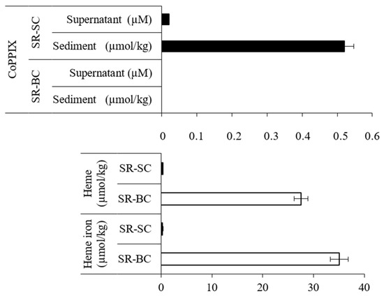 Concentration of CoPPIX, heme and heme iron in SR-BC and SR-SC (µmol/kg of sediment or µM (supernatant)). Selected ion (m/z 621) gas chromatogram of CoPPIX and calibration curve for determining the concentration of CoPPIX are presented in Figures S1 and S2, respectively. HPLC-PAD chromatogram of heme is presented in Figure S3A. AED chromatogram of heme is presented in Figure S5. Calibration curves for determining the concentration of heme and heme iron are presented in Figures S4 and S6, respectively. All presented differences are statistically significant (significance level: p < 0.05). Supplementary results of chemical analyses of SR-BC and SR-SC are presented in Figures S13–S22 and Table S2.