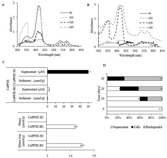 Accumulation of CoPPIX by LM27 strain—UV–Vis spectra of supernatant (A) and bacterial cells (B); t0–t30: time of the experiment. Concentration of CoPPIX, heme and heme iron in CoPPIX-BC and CoPPIX-SC (µmol/g of biomass or µM (supernatant)) (C). Percentage content of CoPPIX in supernatant and cells of CoppIX-BC after 10, 20, and 30 days of cultivation (D). Selected ion (m/z 621) gas chromatogram of CoPPIX and calibration curve for determining the concentration of CoPPIX are presented in Figures S1 and S2, respectively. HPLC-PAD chromatogram of heme is presented in Figure S3A. AED chromatogram of heme is presented in Figure S5. Calibration curves for determining the concentration of heme and heme iron are presented in Figures S4 and S6, respectively. All presented differences are statistically significant (significance level: p < 0.05). Supplementary results of chemical analyses of CoPPIX-BC and Co-PPIX-SC are presented in Figures S23–S32 and Table S3.