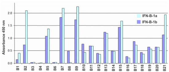 Histogram of the reactivity of antibodies B1–B21 against IFN-β according to the indirect ELISA with sorbed CHO-HuIFN-β-1a (blue bars) and E. coli-HuIFN-β-1b (dark blue bars) at an antibody concentration of 30 ng/mL.