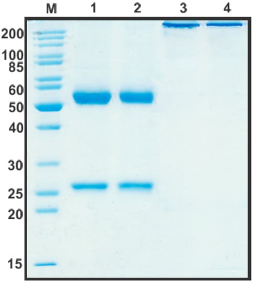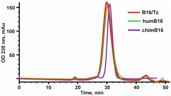 After the construction of humB16 genes and cloning them into the expression vector, both humanized and murine B16 antibodies were produced in CHO cells and purified, and their properties were studied. The yields of purified proteins were measured and counted up to 330 mg/L for chimB16 and 353 mg/L for humB16. Elution profiles obtained by the size-exclusion chromatography of humB16 and chimB16 have similar character, with the retention time of both antibodies ranging from 31–32 min, corresponding to the monomeric form of IgG with a calculated molecular weight 162–165 kDa (Figure 2). The purity of the obtained antibodies is also confirmed by SDS-PAGE (Figure 11); under non-reducing conditions, immunoglobulins migrate as a single band, but after disulfide bond reduction with mercaptoethanol, both humanized and murine antibodies migrate as two bands corresponding to 25 kDa light and 50 kDa heavy chains.