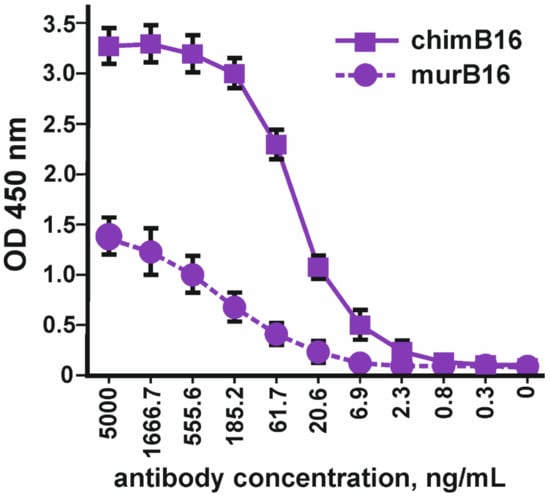 Binding of chimeric antibodies (chimB16) with IFN-β-1a versus murine antibodies (murB16) (Pharmapark, Russia). The error bars indicate means ± SD.
