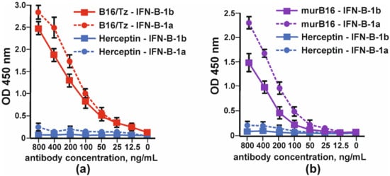 The binding of bispecific antibody B16/Tz versus murine B16 antibody to IFNβ was tested by indirect ELISA. Two forms of interferon, IFN-β1a and IFN-β-1b, were absorbed on each well’s surface. The anti-ErbB2 antibody (Tz) was used as a negative control. Bispecific antibody B16/Tz, like the prototype mouse B16 antibody, binds to both forms of interferon with greater efficiency to the glycosylated form of IFN-β (Figure 5).