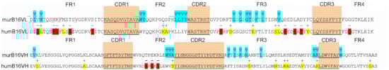 Amino acid sequences of murB16 and hum B16 variable domains. CDRs are underlined, blue for Vernier zones, red and yellow for substitutions.