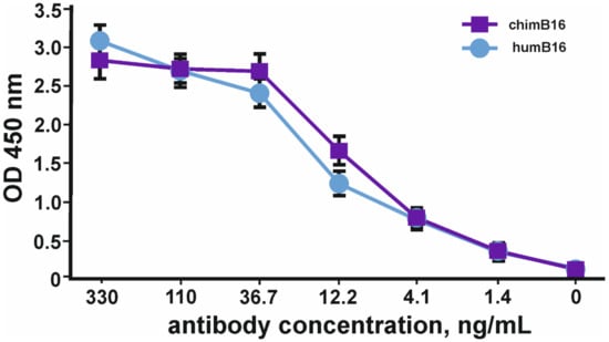 It should be noted that the absolute OD values for murine and chimeric antibodies cannot be compared, since different anti-species conjugates were used for the manifestation of binding. The dissociation constant (Kd) of chimeric antibodies (3.2 × 10−9 M) practically coincides with the Kd of the murine prototype (3.8 × 10−9 M).
