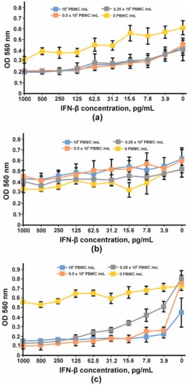 In order to find the appropriate cell line for IFN-β antiproliferative assay, three cell lines, HT29, SKOV-3 and BT474, were tested. After four days of cultivation with serial dilutions of IFN-β and PBMC, the viabilities of the cells were determined using an MTT test. Neither interferon nor PBMC had any impact on BT474 cells (Figure 13b). A more pronounced antiproliferative effect of IFNβ was observed for SKOV-3 cells (Figure 13a); however, the addition of PBMC decreased the slope of the curve and the maximum OD value so that the detection of the growth inhibition effect could be problematic. No significant antiproliferative effect mediated by IFN-β was observed for HT29 cells; nevertheless, the combination of interferon and PBMCs greatly decreased HT29 cell growth. The viability of HT29 cells cultivated without interferon did not change substantially with the addition of 25,000 cells (0.25 × 106 PBMC/mL) or 50,000 cells (0.5 × 106PBMC/mL) per well but decreased by at least 50% when 100,000 PMBCs were added (106 PBMC/mL) (Figure 13c). That is why 100,000 PMBCs/well were unsuitable for further antibody IC measurement. It should be noted that interferon dilutions for the remaining two curves decreased more for 0.5 × 106 PBMC/mL than for 0.25 × 106 PBMC/mL. The maximum antiproliferative effect for 0.5 × 106 PBMC/mL was observed at 15.62 pg/mL of IFN-β and did not change significantly at higher IFN-β concentrations.