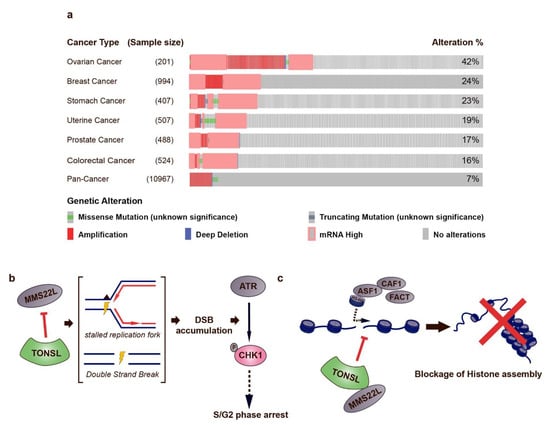 As precision medicine allows for identification of new therapeutic targets, novel targets for cancer therapy are continuously being investigated. This review is focused on non-oncogene addiction, especially genes that are synthetically lethal in the HR pathway, replication stress, and cell cycle check point pathways, here, we discuss a potential new candidate. Tonsuoku-Like DNA Repair Protein (TONSL or NFKBIL2) is a relatively novel gene involved in HR, replication fork repair and chromatin formation [195,196,197,198]. It has been reported that TONSL is overexpressed in hepatocellular carcinoma, and it is implicated in the carcinogenesis of several cancers including lung and esophageal cancer [199,200]. Analysis of TCGA PanCancer studies using cBioPortal.org shows that TONSL is amplified in estimated 7% of all cancer types, 24% in breast cancer, 23% in stomach cancer, and up to 42% in ovarian cancer (Figure 2a, cBioPortal.org).