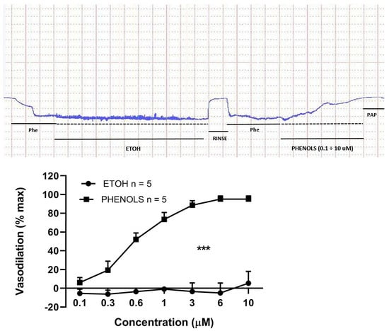 EVOO phenols vasodilation on mesenteric resistance artery. Representative trace showing the effect of Ethanol (EtOH, EVOO phenols vehicle) and EVOO phenols (Phenols, 0.1–10 μM) in phenylephrine pre-constricted mesenteric resistance artery. HEPES-PSS without Ca2+, containing Papaverine (Pap) was added at the end of each experiment to calculate maximum dilation. Several experiments were done and summarized in the figure, which shows a dose-dependent vasodilation for EVOO phenols but not for EtOH. Data are presented as the mean ± SEM, n (experimental number), *** p < 0.001 refers to the area under the curve.