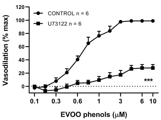 Furthermore, to confirm the contribution of PLC-initiated in the vasodilatory effect of EVOO phenols, a dose-response curve to EVOO phenols was tested in the presence of the PLC inhibitor U73122 (10 μM), which reduced Emax (98.8 ± 1.1% control vs. 27.7 ± 5,1% U73122, p < 0.001) and increased EC50 (0.5 ± 0.06 μM control vs. 1 ± 0.07 μM U73122, p < 0.01), Figure 5.